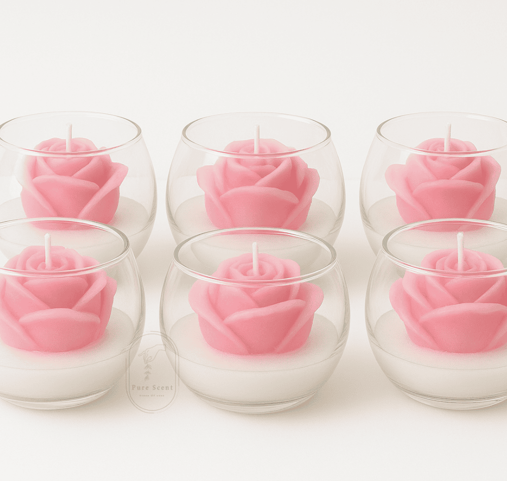 ✨ تخيّلي ضيوفك وهم يشاهدون طاولة أنيقة تتزيّن بكاسات شفافة، تتوسطها شموع وردية على شكل وردة متفتحة، تفوح برائحة ناعمة وتنشر إحساس الفخامة والدفء في المكان.